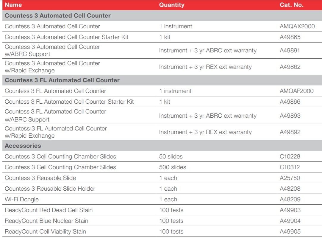 เครื่องนับเซลล์อัตโนมัติรุ่น Countess® 3 และ 3 FL ภายใต้แบรนด์ Invitrogen® จากบริษัท Thermo Fisher Scientific ประเทศสหรัฐอเมริกา เป็นเครื่องนับเซลล์อัตโนมัติขนาดตั้งโต๊ะ สำหรับนับเซลล์เป็น (Live cells), เซลล์ตาย (Dead cells) และจำนวนเซลล์ทั้งหมด (Total cells) ที่ย้อมติดสี Trypan blue และสามารถนับเซลล์ที่ย้อมสีฟลูออเรสเซนต์ได้ (ในรุ่น 3 FL) โดยมาพร้อมกับโหมดอัตโนมัติที่โดดเด่นไม่ซ้ำใคร ไม่ว่าจะเป็น การปรับแสงอัตโนมัติ การปรับโฟกัสอัตโนมัติ และการบันทึกอัตโนมัติ ช่วยให้คุณสะดวกสบายและประหยัดเวลาได้มากกว่า
