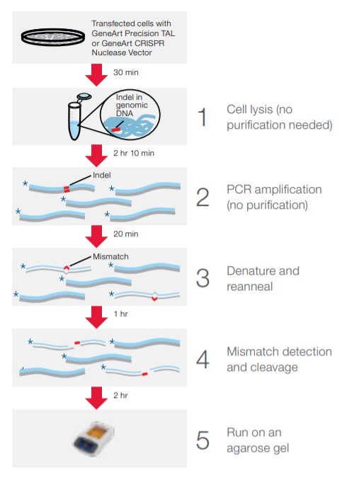 โดยหลักการการทำงานของ GeneArt Genomic Cleavage Detection Kit จะยึดหลักการพื้นฐาน 3 อย่างคือ เป็นวิธีที่ง่าย, เชื่อถือได้ และรวดเร็ว ในการตรวจสอบตำแหน่งที่เกิดการตัดอย่างจำเพาะเจาะจง ของgDNA จาก cell ที่ผ่านการ transfection ด้วย constructs expressing engineered nucleases ได้แก่ Transcription activator-like effector nuclease (TALEN), Clustered Regularly Interspaced Short Palindromic Repeats (CRISPR)/Cas9 หรือ Zinc-finger nuclease (ZFN) หลังจากเกิดกระบวการตัดบน gDNA ไม่ว่าจะเป็น insertions หรือ deletions (indels) ที่เกิดขึ้นจากกระบวนการซ่อมแซมตัวเองของเซลล์ (cellular repair mechanisms) จากนั้นนำมาเพิ่มจำนวนด้วยการทำ PCR เมื่อได้ PCR product มาแล้วจะทำการ denature เพื่อแยกสาย double-strand DNA ออกจากกัน แล้วตามด้วยการทำ reanneal ซึ่งจะทำให้เกิดการเข้าคู่กันใหม่ ของ single-strand DNA ที่เกิด indel และไม่เกิด indel แบบ mismatches ทำให้สามารถตรวจสอบ efficiency การเกิด cleavage ได้จากการตัดของ T7 endonuclease I (T7EI) แล้ววิเคราะห์ผลจากความหนา และรูปแบบของ DNA band ด้วยการทำ gel electrophoresis