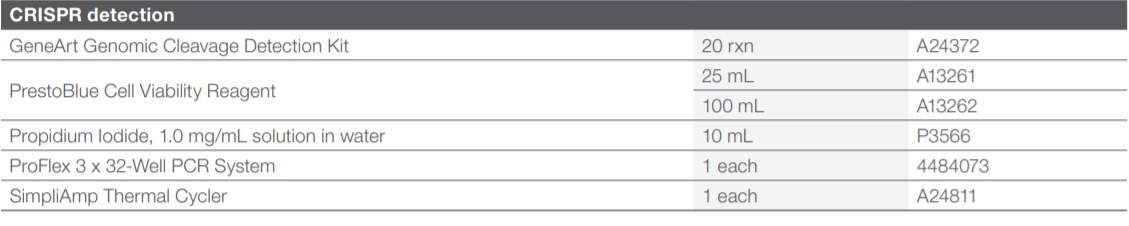 GeneArt Genomic Cleavage Detection Kit เป็นชุดตรวจสอบการเกิด Insertion และ Deletion (Indel) บน genomic DNA ของ cell line ในเชิงปริมาณด้วยเอนไซม์ T7 endonuclease I ได้อย่างรวดเร็วที่สุดหลังจากมีการ validate การทำงานของ CRISPR-Cas9 gRNA หรือ TAL effector nuclease ในการวิจัยด้าน cell engineering