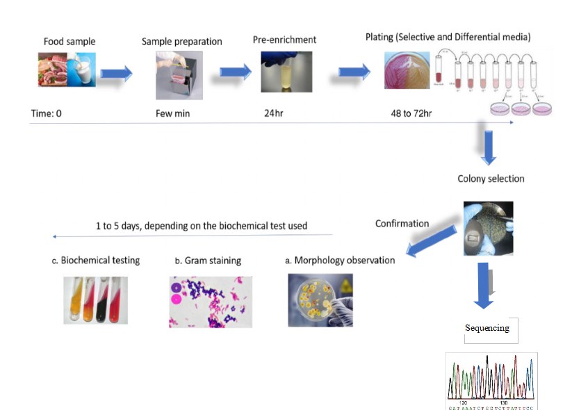 การตรวจสอบการปนเปื้อนของเชื้อ Salmonella ในอาหาร จะมีวิธีในการ isolate เชื้อที่ประกอบไปด้วยการเตรียมตัวอย่าง, เพิ่มปริมาณเชื้อ, เจือจาง, culture ใน selective medium และ เลือก pure colony ไปทดสอบต่อไป ซึ่งการทดสอบต่อไปที่จะใช้ในการบ่งชี้สายพันธุ์ของเชื้อแบคทีเรีย อาจทำได้โดยการทดสอบ biochemical test หรือ การ sequencing ดังรูปที่ 1