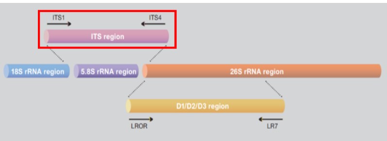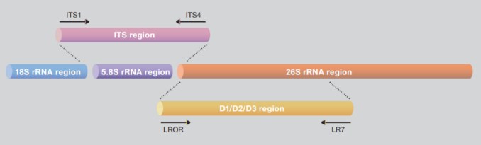 การจำแนกสายพันธุ์รา และยีสต์ โดยทั่วไปจะใช้บริเวณ ITS (internal transcribed spacer) แต่ด้วยความแตกต่างกันของบริเวณ ITS ในสิ่งมีชีวิตแต่ละสปีชีส์ จึงทำให้มีการใช้บริเวณอื่น ๆ เพิ่มเติมเพื่อให้เกิดความจำเพาะมากขึ้น เช่น บริเวณของยีน 18S rRNA หรือ บริเวณของยีน 26S rRNA (D1/D2/D3 region)