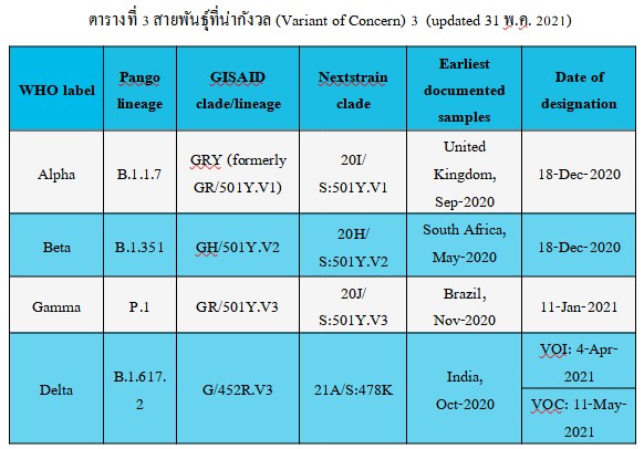 ซึ่งสายพันธุ์เหล่านี้จะต้องอาศัยการพัฒนาสำหรับการตรวจวินิจฉัยโรค การปรับเปลี่ยนเกี่ยวกับวัคซีน หรือการรักษาเพื่อให้สามารถควบคุมสายพันธุ์เหล่านี้ได้ โดยสายพันธุ์ที่น่ากังวลมีข้อมูลดังแสดงในตารางที่ 3