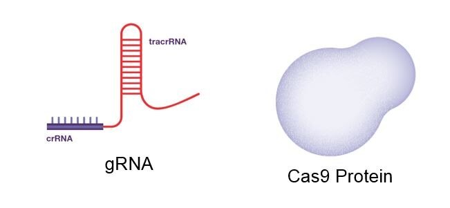 CRISPR-Cas9 system ประกอบด้วย short noncoding guide RNA (gRNA) ที่มี 2 ส่วนด้วยกันคือ target-specific CRISPR RNA (crRNA) และ auxiliary trans-activating crRNA (tracrRNA) ซึ่ง gRNA จะทำงานร่วมกับ Cas9 protein ซึ่งจะเข้าจับอย่างจำเพาะบน genomic DNA ด้วยการจับคู่ระหว่าง crRNA sequence และ target sequence (รูปที่ 1)