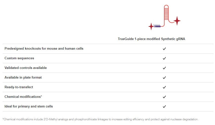 TrueGuide Synthetic CRISPR gRNA เป็น ready-to-transfect CRISPR guide RNAs ซึ่งถูกออกแบบด้วย algorithm ที่เป็นลิขสิทธิ์เฉพาะสำหรับ high-efficiency editing และทำ chemical modifications โดย gRNA ดังกล่าวเรียกว่า “pre-designed” ที่มีการรับประกันว่า gRNA ดังกล่าวว่าจะสามารถ knockdown ตำแหน่งเป้าหมายได้แบบ high specificity ของ human และ mouse genomes สามารถตรวจสอบข้อมูลได้ เพียงกรอก Entrez ID, Geme symbol หรือ Assay ID เท่านั้น
