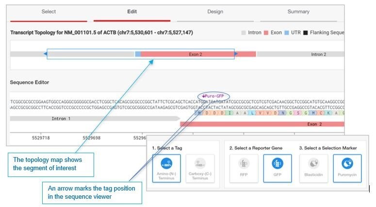 2. จำเพาะตำแหน่งที่ต้องการ edit เช่น กรณีต้องการเพิ่ม GFP tag บน N-terminus ของยีน ACTB สามารถ insert ตัว selection marker เพื่อที่จะให้ได้มาซึ่งเซลล์ที่ติด GFP tag ได้สำเร็จ และสามารถใช้ puromycin ในการกำจัดเซลล์ที่ไม่มีการตัดต่อออกไปได้