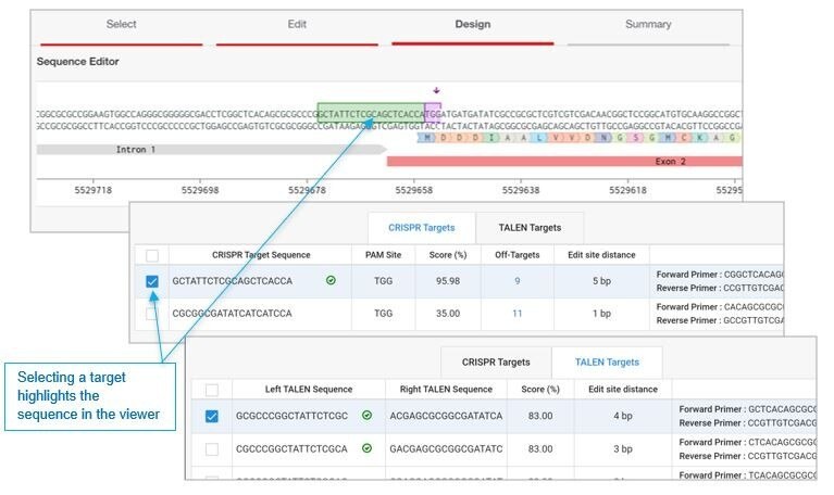 3. ออกแบบ CRISPR และ/หรือ TALEN target จากการแนะนำ ซึ่งโปรแกรมจะแนะนำ gRNA ที่ดีที่สุด โดยจะมีสัญลักษณ์สีเขียวในการบ่งบอก