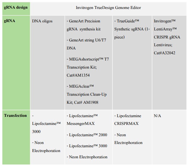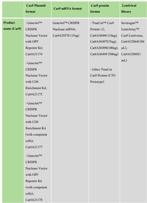 จะเห็นได้ว่า CRISPR-Cas9 ได้รับความนิยมอย่างมากในการทำ genome editing ซึ่งผู้วิจัยสามารถเลือกใช้รูปแบบได้อย่างหลากหลาย ขึ้นอยู่กับงานวิจัย โดยทาง Invitrogen สามารถรองรับความต้องการของท่านได้ดังนี้