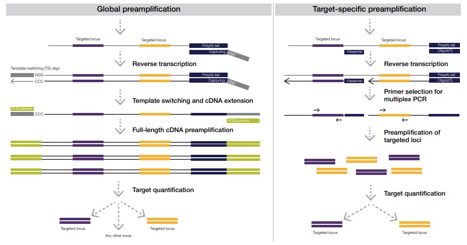 รูปที่ 4 เปรียบเทียบกระบวนการและผลลัพธ์ที่ได้จากการทำ global preamplification (ซ้าย) และ target-specific preamplification (ขวา)