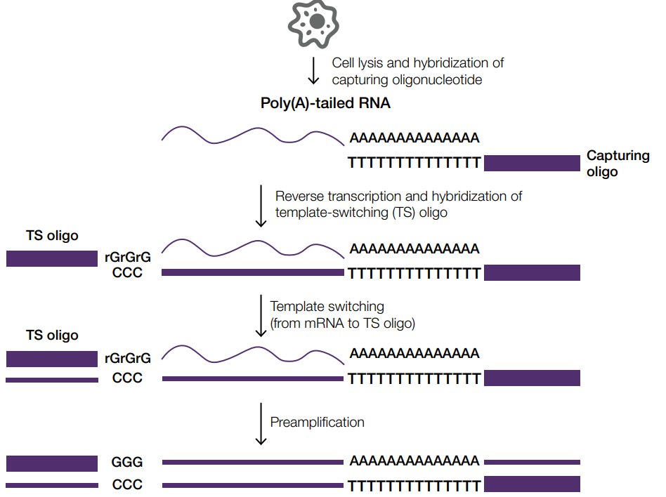 SuperScript IV Single Cell/Low-Input cDNA PreAmp Kit มีการใช้ SMART (switching mechanism at the 5ʹ end of RNA transcript) technology โดยอาศัยสมบัติของ terminal deoxynucleotidyl transferase (TdT) ทำงานร่วมกับ SuperScript IV Reverse Transcriptase ด้วยการใช้ Capturing oligonucleotide ที่มีโครงสร้าง dT เป็น primer สำหรับสร้าง first strand cDNA synthesis จาก RNA ที่มีองค์ประกอบของ poly(A) เมื่อเอนไซม์ reverse transcriptase มาถึงที่ปลาย 5’ ของ RNA template TdT จะทำหน้าที่ในการเติม 1–3 nucleotides ที่มากกว่าปกติไปยังปลายของ cDNA จากนั้นจะเกิด template switching และเชื่อมเข้ากับ adapter sequence ในตำแหน่งปลาย 3’ ของ cDNA อย่างอิสระ จะสังเกตได้ว่า SuperScript IV Reverse Transcriptase มี sensitivity สูง และมีประสิทธิภาพในการเกิด template switching ส่งผลให้มีความสามารถในการจับกับ target ได้ แม้มีปริมาณน้อย