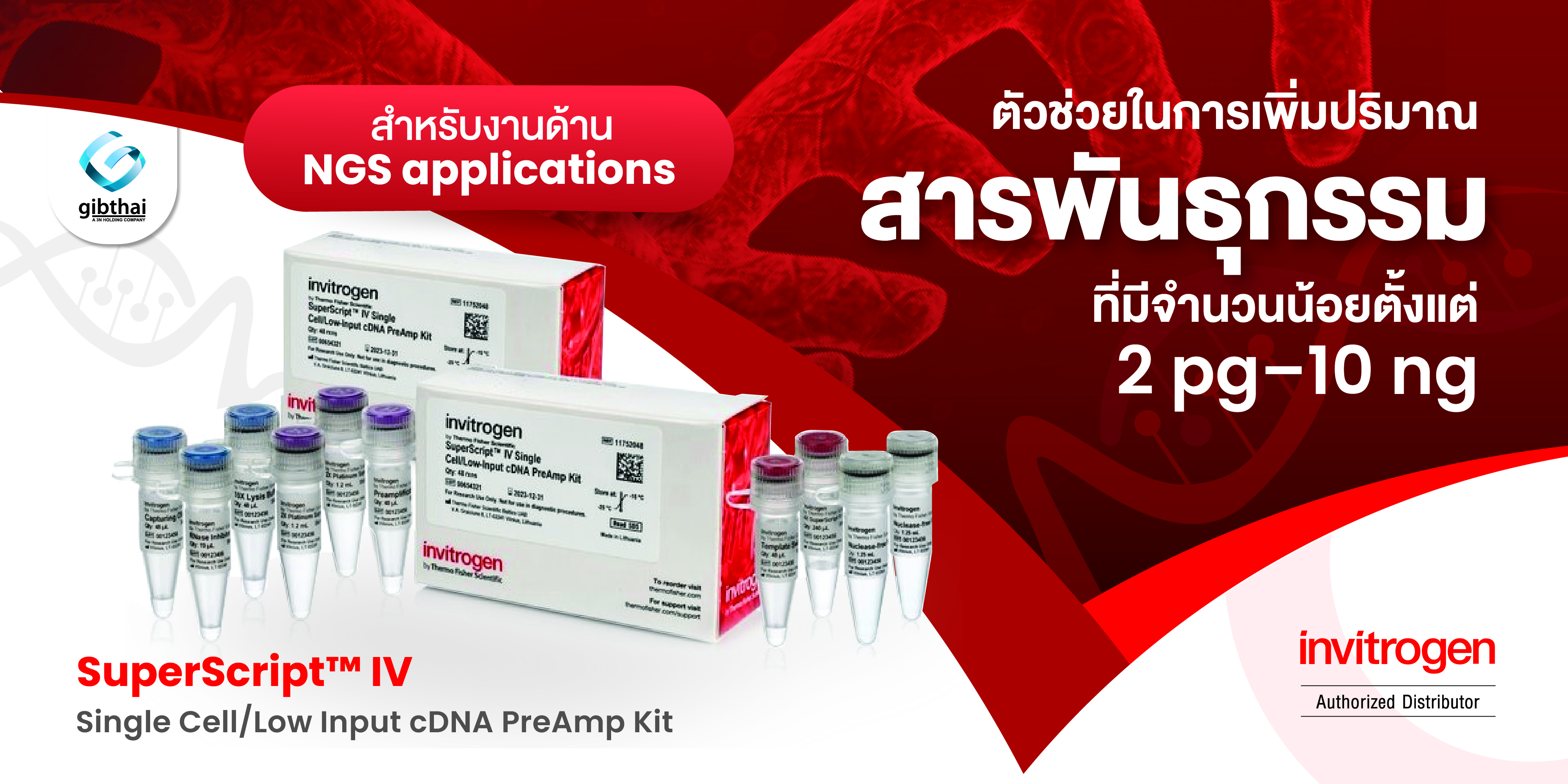 ท่านกำลังมองหาตัวช่วยเพิ่มปริมาณ cDNA จากตัวอย่าง total RNA หรือตัวอย่างที่มีจำนวนเซลล์น้อยเพื่อใช้ในการทำ Real-time PCR หรือ Next Generation Sequencing (NGS) ใช่หรือไม่ หากใช่ SuperScript™ IV Single Cell/Low Input cDNA PreAmp Kit สามารถช่วยท่านได้ จากประสิทธิภาพในการcDNA synthesis และเพิ่มจำนวนจาก single cells ตั้งแต่ 1-1,000 cell ได้โดยตรง หรือในกรณีที่มีปริมาณ total RNA น้อย ตั้งแต่ 2 pg–10 ng ก็สามารถทำได้ จุดเด่นของผลิตภัณฑ์คือมีการนำ SuperScript IV Reverse Transcriptase และ Platinum SuperFi U DNA Polymerase มาใช้ในชุดน้ำยา ทำให้ได้ yields, sensitivity และ accuracy สูง ใช้เวลาในการเตรียม reaction สั้น