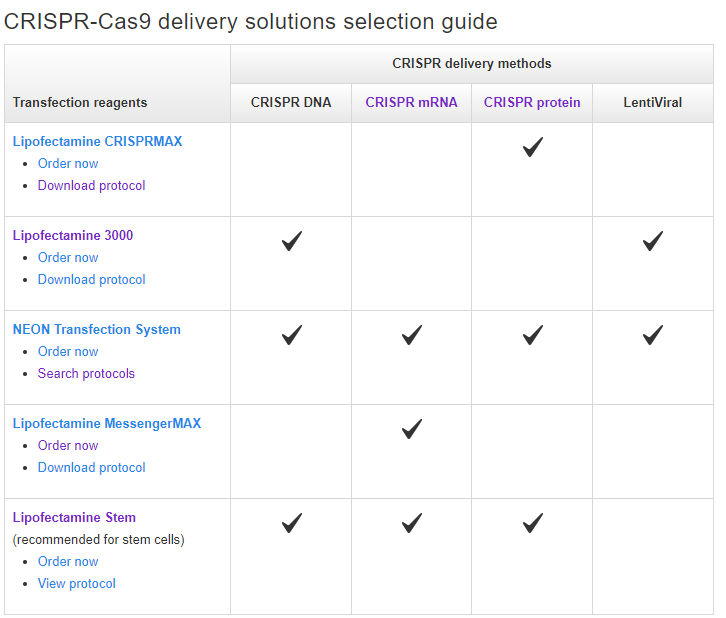 อย่างไรก็ตามการเลือกใช้ transfection system สำหรับงาน CRISPR-Cas9 นอกจากจะต้องคำนึงถึง Cas9 format แล้วจะต้องใช้ reagent ให้เหมาะสมกับเซลล์แต่ละชนิดซึ่งจะส่งผลให้การนำส่งเกิดขึ้นอย่างมีประสิทธิภาพ รวมถึงคุณภาพในการแก้ไขในระดับ genome ในตำแหน่งเป้าหมาย
