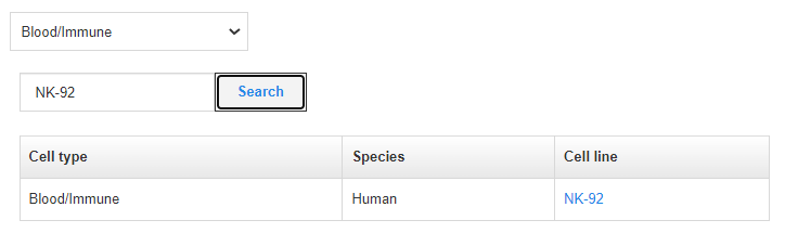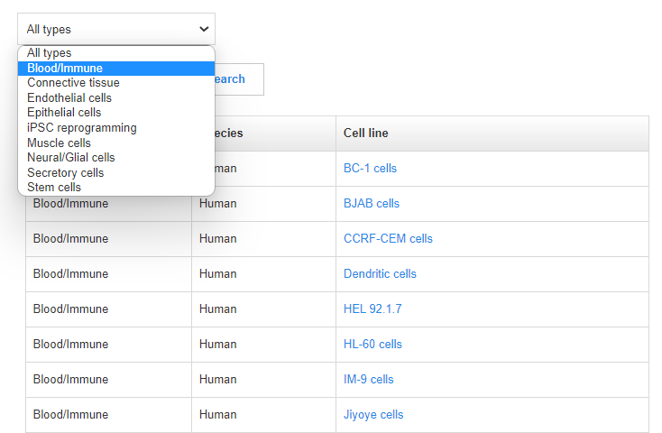 นอกจากนี้หากท่านใดไม่อยางเสียเวลาในการไล่หาข้อมูล สามารถ search หาข้อมูลได้อย่างง่ายดายจากการการกด drop down “All type” จากนั้น เลือก cell type ที่ต้องการ และใส่ชื่อเซลล์ลงในช่อง แล้วกด “Search”