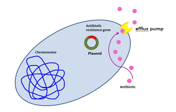 เป็นการกำจัดยาปฏิชีวนะโดยการใช้โปรตีนที่มีความสามารถในการปั๊มที่อยู่ในผนังเซลล์ ทำหน้าที่ปั๊มยาปฏิชีวนะที่จะเข้าสู่เซลล์ เช่น Pseudomonas aeruginosa สามารถผลิตโปรตีนที่ทำหน้าที่ในการปั๊มยาปฏิชีวนะ เช่น fluoroquinolones, beta-lactams, chloramphenicol, และ trimethoprim ที่จะเข้าสู่เซลล์