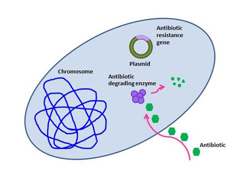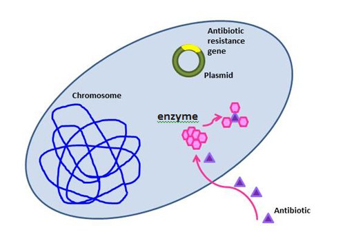 เป็นการดื้อยาปฏิชีวนะที่เกิดจากแบคทีเรียมีการผลิตเอมไซม์ที่มีความสามารถไปทำลายยาปฏิชีวนะได้ เช่น Klebsiella pneumoniae สามารถผลิตเอมไซม์ carbapenemases ที่ไปทำลายยาปฏิชีวนะ carbapenem และ beta-lactam