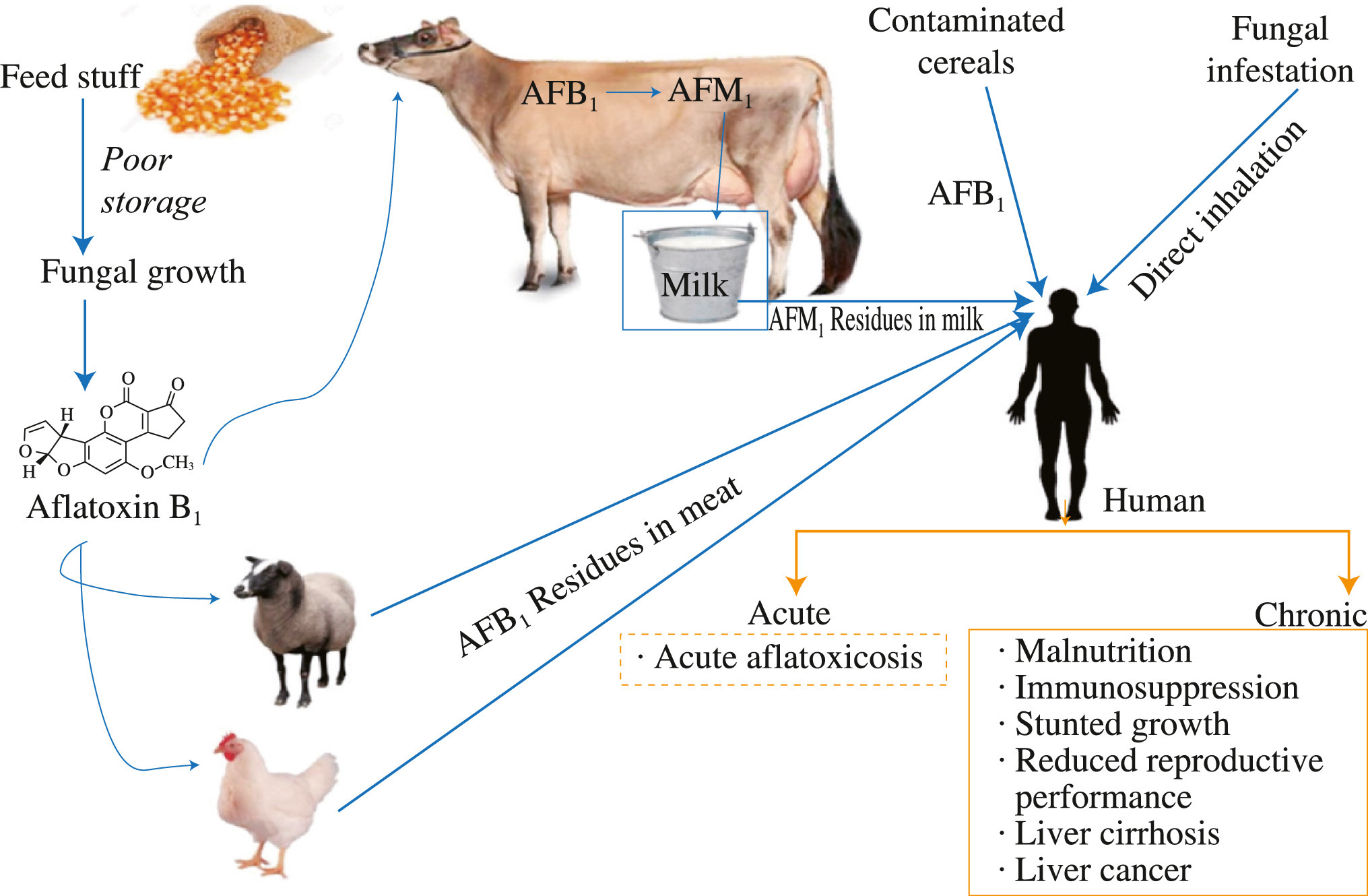 รูปที่ 1 แหล่งที่มาต่างๆ ของการปนเปื้อนของแอฟลาทอกซินสู่มนุษย์