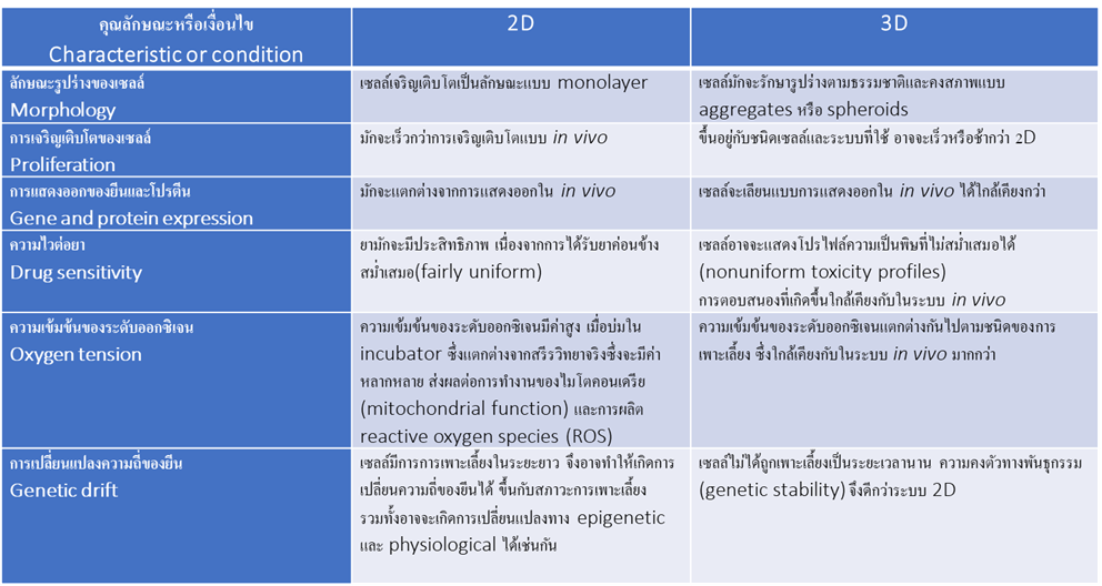 ตารางที่ 1 ความแตกต่างที่สำคัญระหว่างระบบการเพาะเลี้ยงเซลล์แบบสองมิติและสามมิติ