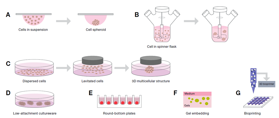(A) Hanging-drop culture. (B) Spinner flask culture. (C) Magnetic levitation of cells preloaded with magnetic nanoparticles. (D) Static suspension of cells in low-attachment plates. (E) Static suspension in round-bottom 3D culture plates. (F) ECM embedding. (G) 3D bioprinting.