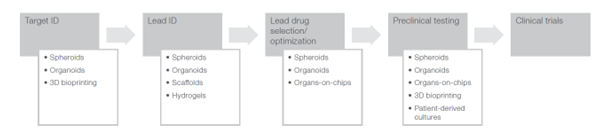 กระบวนการค้นพบยามีความซับซ้อนและมีหลายแง่มุม การเพาะเลี้ยงเซลล์แบบสามมิตินับเป็นอีกวิธีที่สำคัญในการอำนวยความสะดวกกระบวนการนี้ โดยการช่วยเรื่องการคาดการณ์ประสิทธิภาพของยาได้มากขึ้นรวมทั้งด้านความเป็นพิษอีกด้วย (Fang 2017) การเพาะเลี้ยงเซลล์แบบสามมิติประเภทต่างๆมีบทบาทในการสาธิตกิจกรรมและความปลอดภัยของสารที่สนใจดังกล่าว ตั้งแต่การระบุเป้าหมายไปจนถึงการทดสอบขั้นพรีคลินิก (preclinical) ดังแสดงในรูปที่2