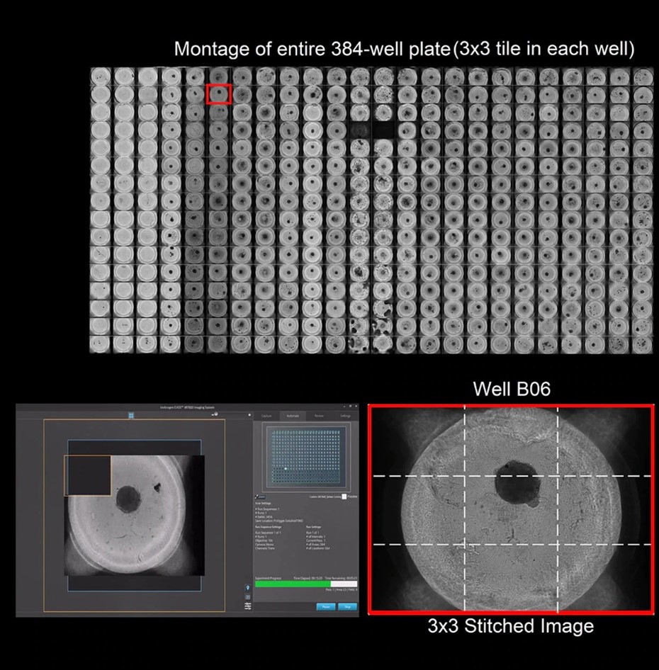 Figure 2. A549 spheroids imaged label-free (brightfield) on an EVOS M7000 using a 10x Olympus SApo objective in a 384-well plate to demonstrate the speed and efficacy of 384-well screening.