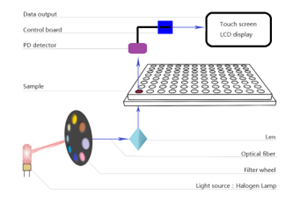 ภาพแสดง ตัวอย่างการทำงานของเครื่อง Microplate reader แบบกำหนดตัวกรองแสง (Filter)