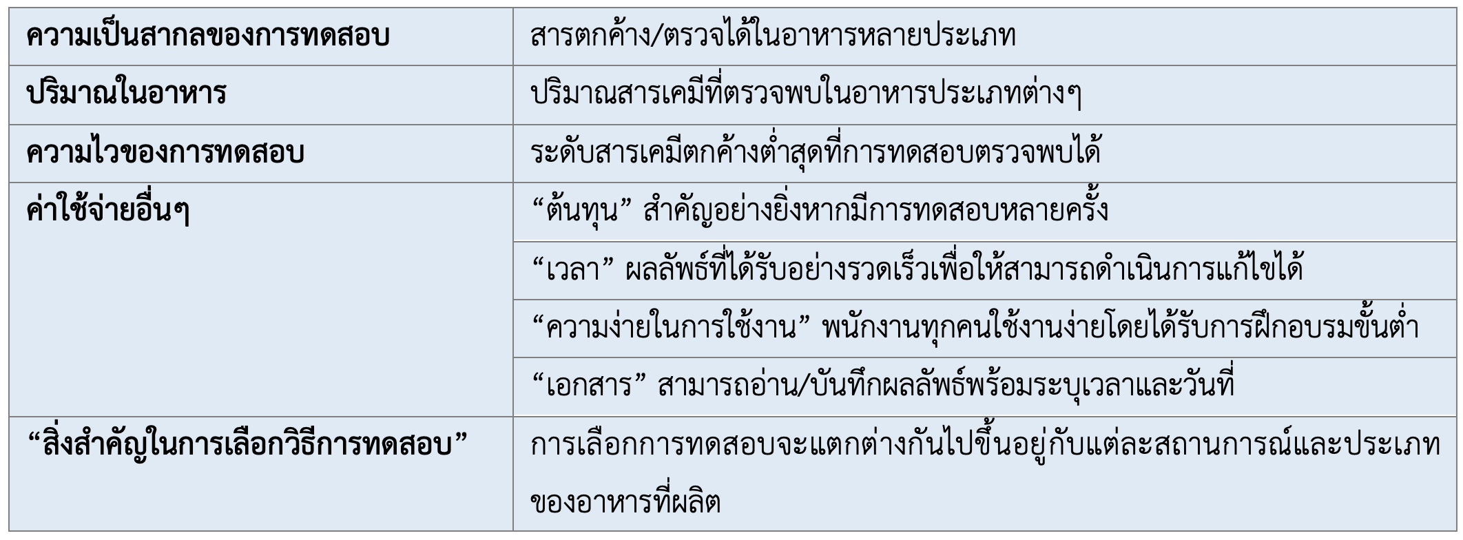 ตารางที่ 1. ข้อควรพิจารณาในการใช้การทดสอบทางเคมีอย่างรวดเร็ว