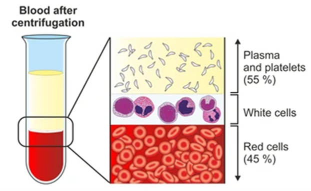 ภาพแสดงองค์ประกอบของเลือดหลังผ่านการหมุนเหวี่ยง