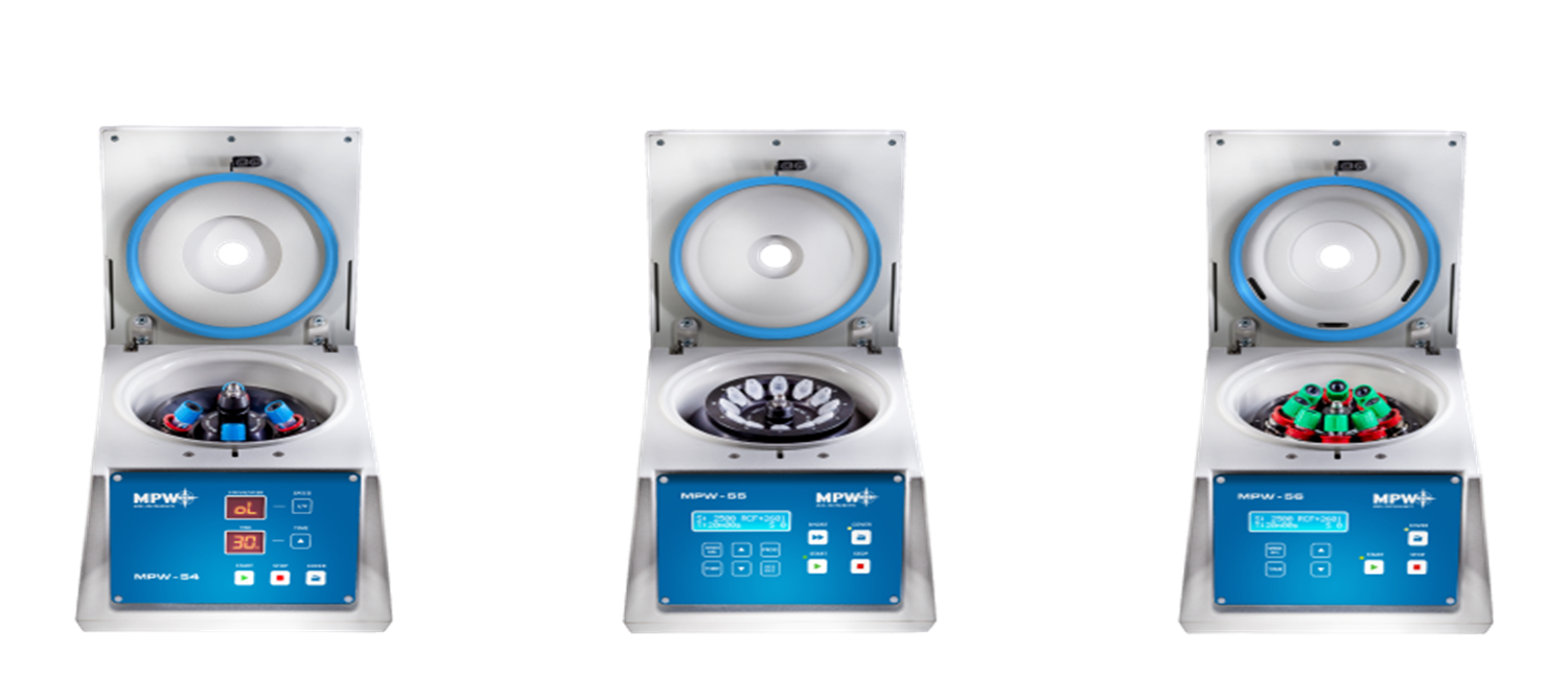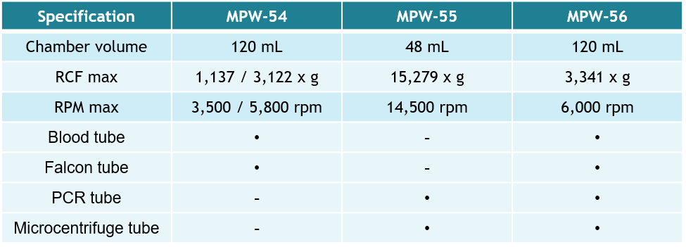 ซึ่งจากข้อมูลที่กล่าวมาข้างต้น บริษัท MPW จึงได้มีการพัฒนาเครื่องปั่นเหวี่ยงขนาดเล็กซึ่งสามารถใช้งานได้กับห้องปฏิบัติการที่หลากหลาย และไม่กินพื้นที่ในห้องปฏิบัติการ โดยมีด้วยกัน 3 รุ่น คือ