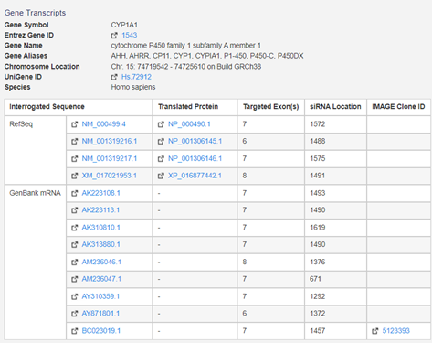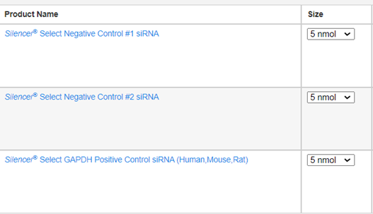 ซึ่งหากทางผู้วิจัยมียีนเป้าหมายที่ต้องการที่จะศึกษาด้วย RNAi ในสิ่งมีชีวิตที่เป็น Human, Mouse, Ratสามารถ search หา siRNA ที่ต้องการผ่านหน้า Website ของ ThermoFisher: https://www.thermofisher.com/th/en/home/life-science/rnai/synthetic-rnai-analysis.html โดยจะแสดงรายละเอียดของ siRNA ต่อยีนเป้าหมาย ประกอบด้วย