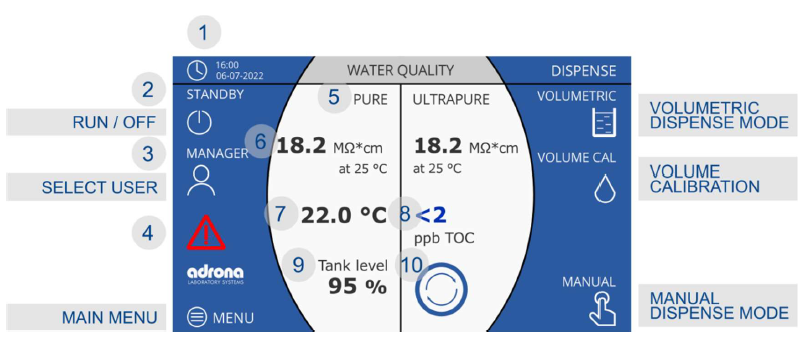 ตัวเครื่องมาพร้อม หน้าจอสีระบบสัมผัสขนาดใหญ่ ออกแบบให้ใช้งานง่าย และทันสมัย ช่วยให้ผู้ใช้งานสามารถเข้าถึงฟังก์ชันต่าง ๆ ได้อย่างสะดวก นอกจากนี้ ตัวเครื่องยังสามารถแสดงผลคุณภาพของน้ำ และข้อความแจ้งเตือน (Alarm messages) รวมถึงการแจ้งเตือนการเปลี่ยนไส้กรองเมื่อถึงเวลา เพื่อความสะดวกในการบำรุงรักษา และช่วยยืดอายุการใช้งานของระบบ