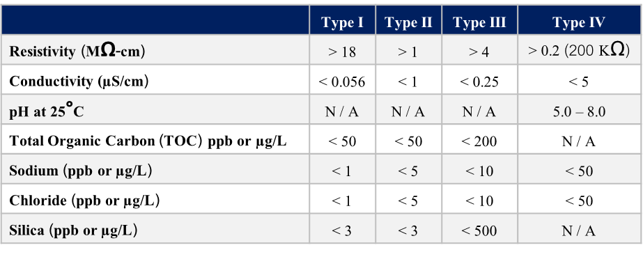 * หมายเหตุ : มาตรฐาน ASTM แบ่งย่อยอีกเป็น A, B และ C ซึ่งสามารถใช้ร่วมกับน้ำประเภท I, II, III หรือ IV ข้างต้นได้ เมื่อจำเป็นต้องการควบคุมระดับของแบคทีเรีย