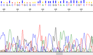 ภาพที่ 3 ตัวอย่าง DNA ที่มีการเพิ่มปริมาณและนำไปทำ Sanger sequencing ที่ให้ผลผิดพลาด ไม่แม่นยำ และยังมีลักษณะของ Noise ค่อนข้างสูง ทำให้ผลการอ่านเบสไม่น่าเชื่อถือ