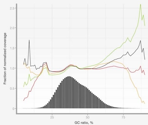 ภาพที่ 1 ระดับ GC bias ที่แตกต่างกันใน library ที่เพิ่มจำนวนด้วย PCR enzyme master mix ชนิดต่างๆ