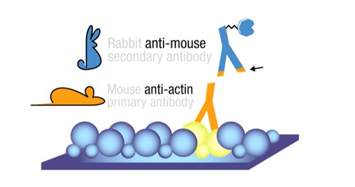 รูปที่ 2 แสดงหลักการใช้ Mouse anti-actin เป็น Primary antibody เพื่อจับโปรตีนเป้าหมาย (Actin) และใช้ Rabbit anti-mouse เป็น secondary antibody เพื่อจับกับ Primary antibody อีกทีหนึ่ง ซึ่งช่วยเพิ่มสัญญาณในการตรวจวัดโปรตีน