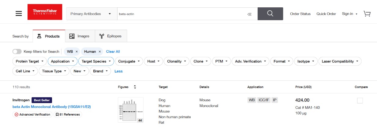 สำหรับนักวิจัยที่สนใจผลิตภัณฑ์ Invitrogen Antibody ไม่ว่าจะเป็น β-actin antibody หรือแอนติบอดีอื่น ๆ สำหรับงาน Western blotting บริษัท กิบไทย จำกัด (Gibthai Co., Ltd.) เป็นตัวแทนจำหน่ายอย่างเป็นทางการของ Thermo Fisher Scientific ผู้ใช้งานสามารถเลือกแอนติบอดีที่ต้องการได้จากเว็บไซต์ของ Thermo Fisher Scientific โดยพิจารณาจากเกณฑ์ต่าง ๆ เช่น Protein target, Application, Target species, Host และอื่น ๆ