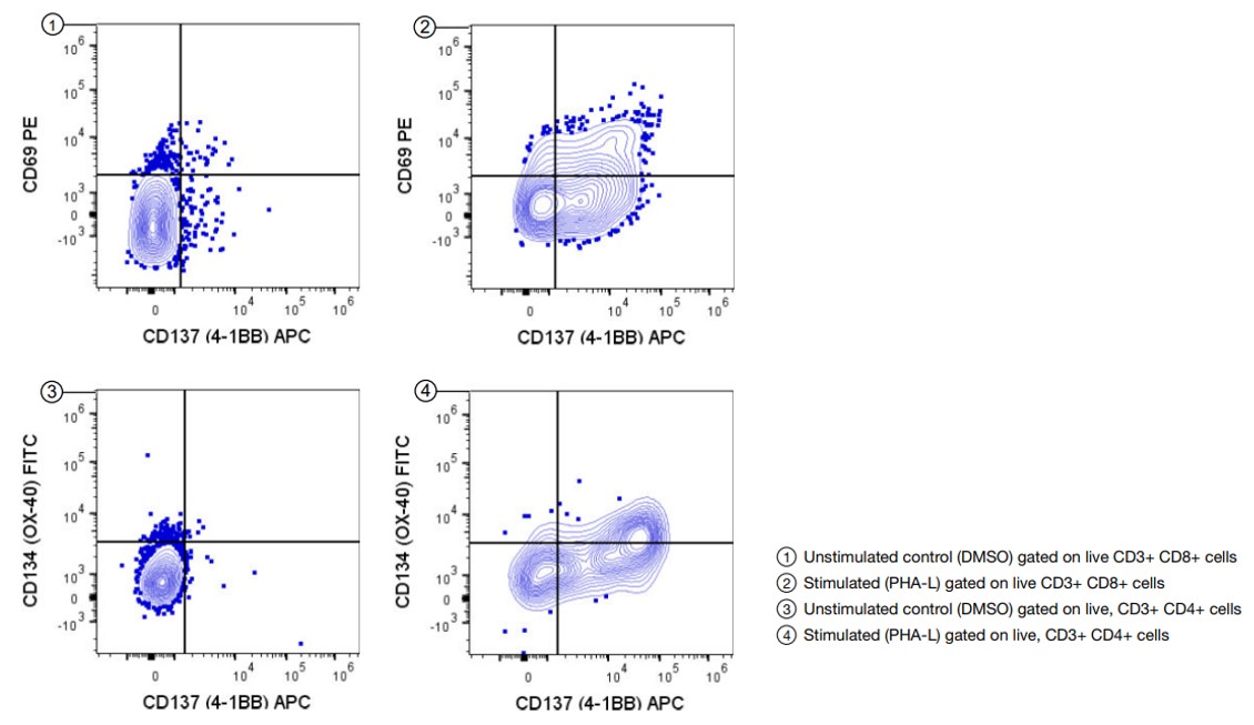แต่เนื่องด้วยการแสดงออกของเซลล์ตามธรรมชาตินั้นมีความหลากหลาย และค่อนข้างซับซ้อน ชุดทดสอบ eBioscience™ Immune Response T Cell Activation Induced Markers Kit จึงถูกออกแบบมาเพื่อนำมาใช้ในการศึกษาการตอบสนองของ Human T-cell ซึ่งสามารถวัดผลการทดลองได้กับ flow cytometry โดยภายในชุดทดสอบนี้จะประกอบไปด้วย buffers, viability dye, antibodies สำหรับตรวจจับ CD69, CD134 (OX-40), และ CD137 (4-1BB), Compensation Beads ไปจนถึงมีสารกระตุ้นควบคุม (positive control stimulation reagent) ทำให้ใช้งานได้ง่าย ให้ผลลัพธ์ที่สอดคล้องกัน