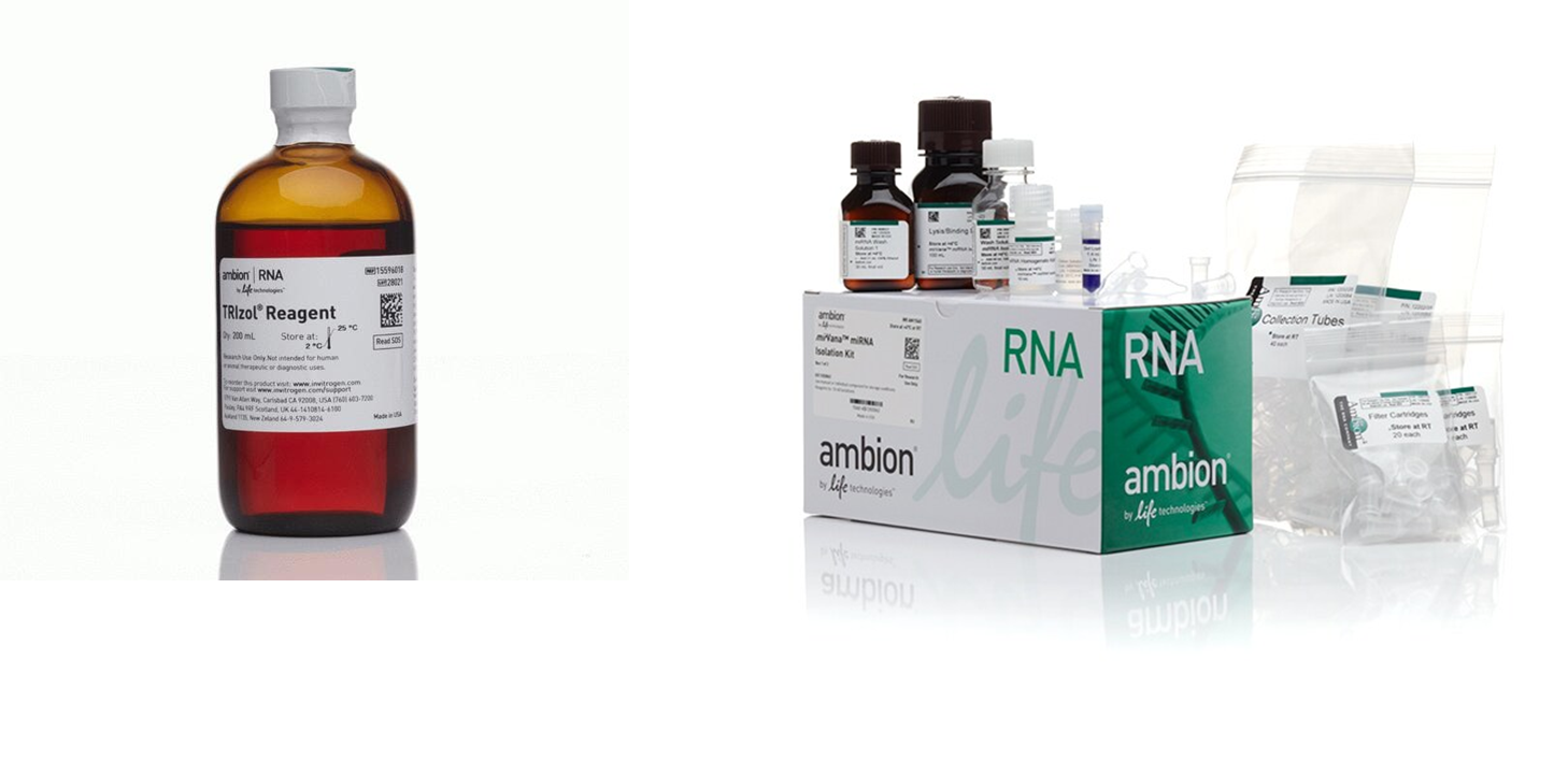 รูปที่ 1 TRIzol reagent (ซ้าย) และชุดสกัด mirVana™ miRNA Isolation Kit (ขวา)