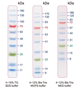 2. โปรตีนมาตรฐานที่ติดสี (Prestained protein marker) : เป็นโปรตีนมาตรฐานที่โปรตีนทุก ขนาดจะย้อมสีแล้วเหมาะสำหรับการศึกษาโปรตีนทุกชนิด ใช้ในการวิเคราะห์โปรตีนที่ต้องการติดตามการเคลื่อนที่ในขณะรัน SDS-PAGE สามารถเห็นสีย้อมที่ติดอยู่บนโปรตีนอย่างชัดเจนโดยไม่ต้องนำไปย้อมหลังรันเจลเสร็จ และสามารถนำไปใช้ต่อได้ในการทำ Western Blot ได้อีกด้วย ตัวอย่างของโปรตีนมาตรฐาน